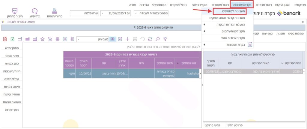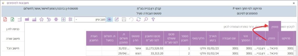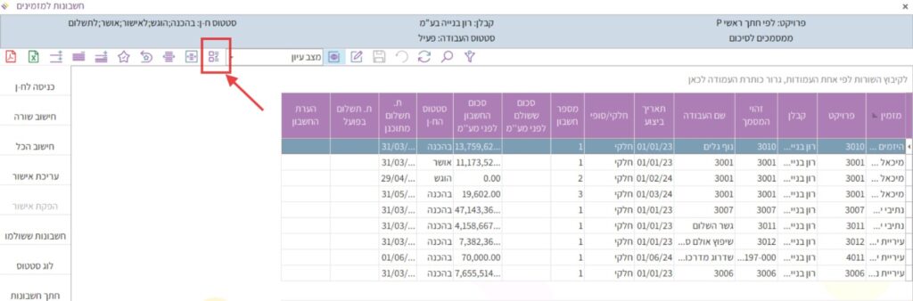 החשבונות המוצגים במסך הם מתוך הפרויקטים שהוגדרו בחתך הפרויקטים הראשי.