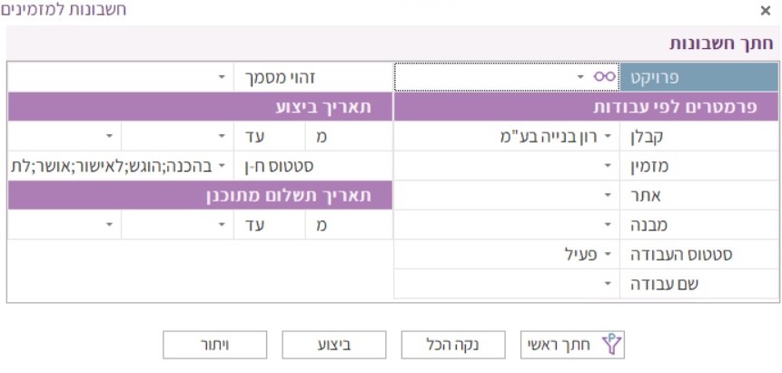 בחלונית “חתך חשבונות” ניתן להגדיר מגוון קריטריונים לסינון רשימת החשבונות. למשל, ניתן לסנן לפי “סטטוס החשבון”, לפי תאריך הביצוע, לפי המזמין ועוד. ניתן גם לשלב מספר קריטריונים לסינון: