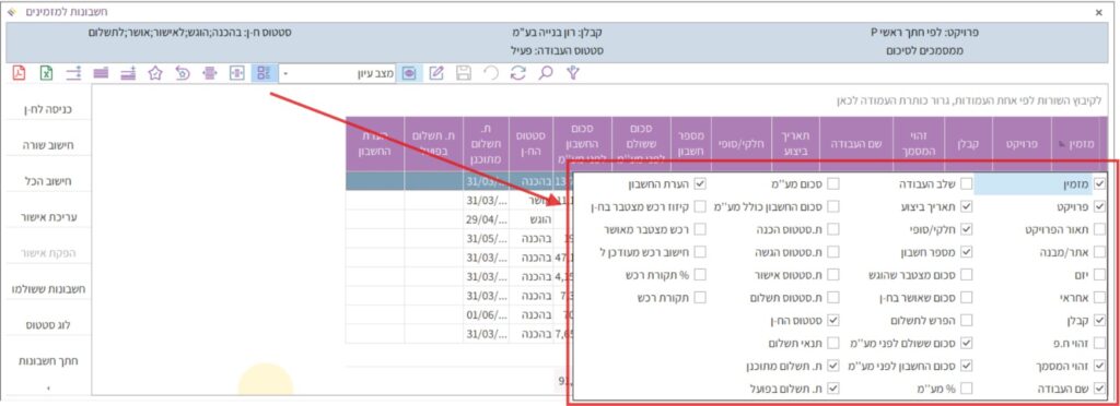 ניתן לבחור את העמודות שיוצגו במסך “חשבונות למזמינים” באמצעות לחיצה על הכפתור “בחירת עמודות” בסרגל הכלים העליון: