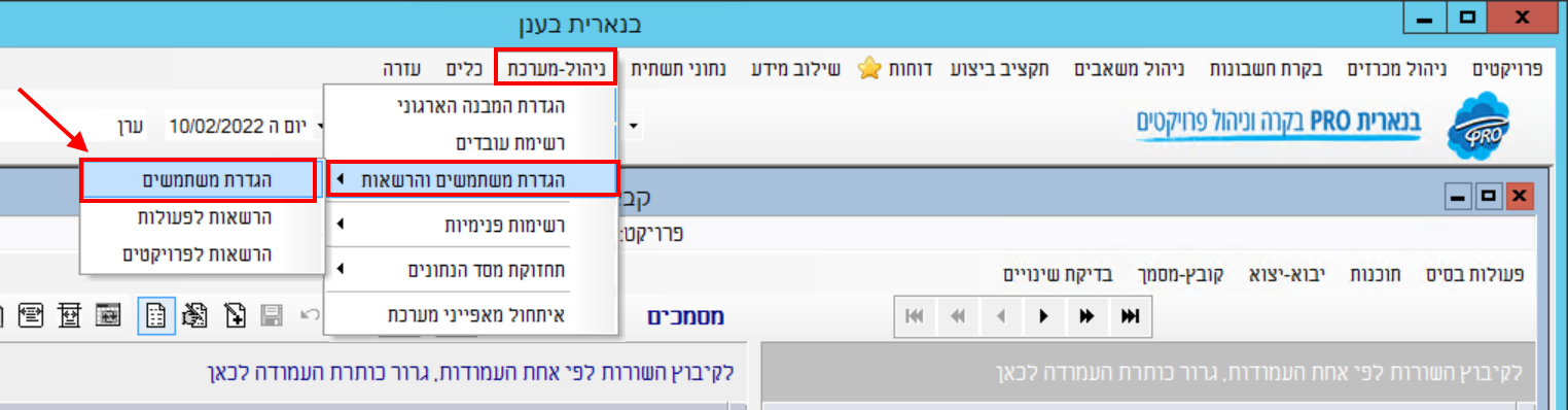 2. במסך הראשי של בנארית להיכנס לתפריט “ניהול מערכת” > להצביע על “הגדרת משתמשים והרשאות” > ובתפריט המשנה לבחור בפקודה “הגדרת משתמשים”: