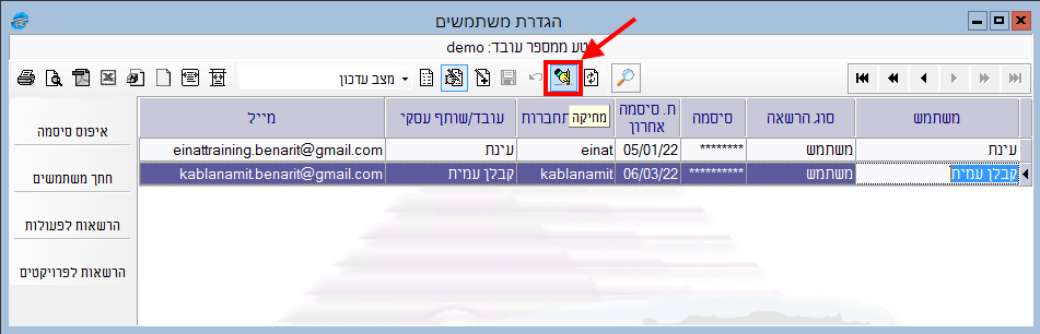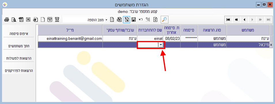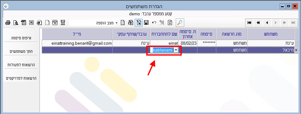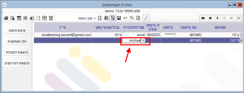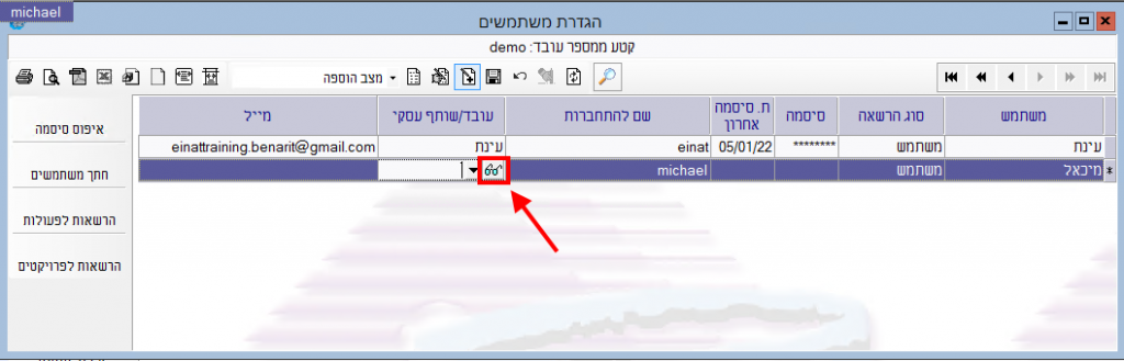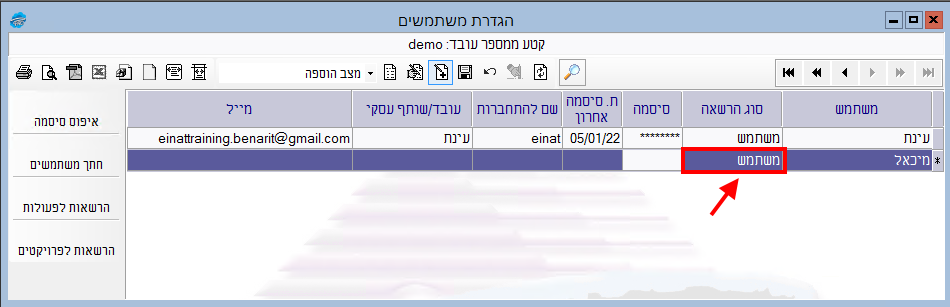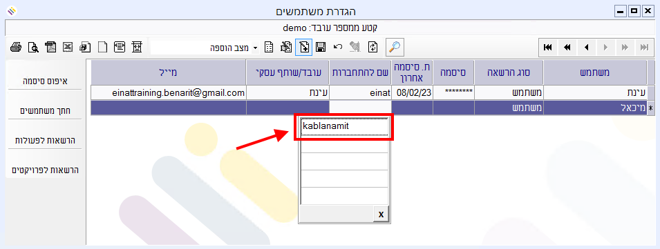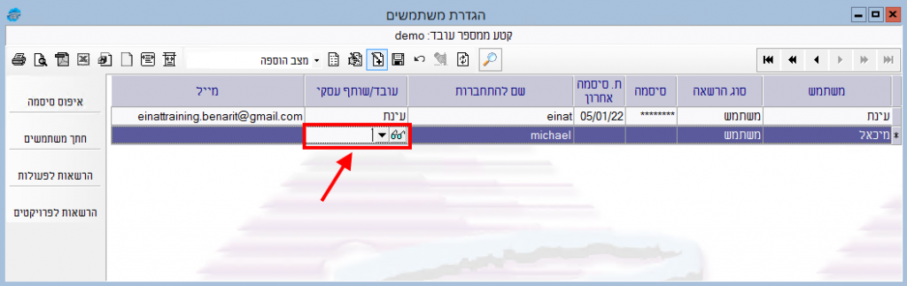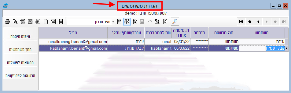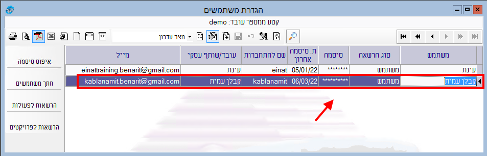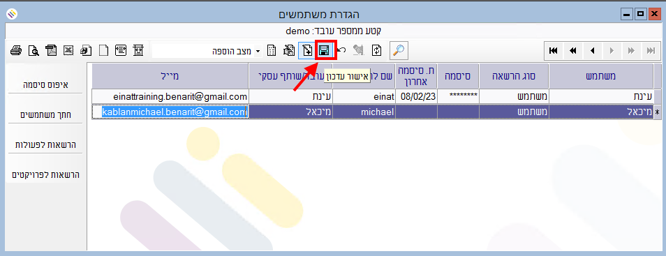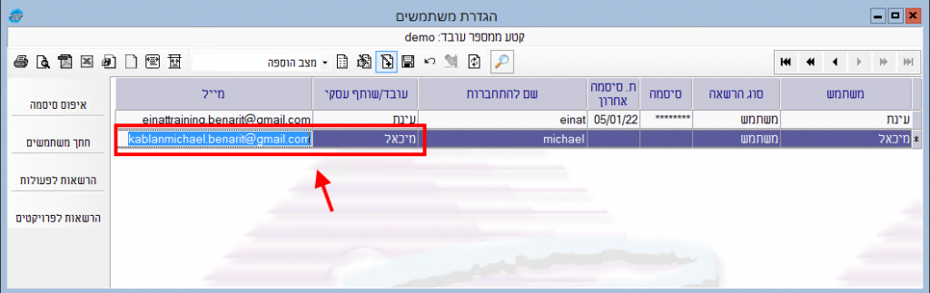 14. המסך “רשימת עובדים” נסגר, ופרטי העובד החדש (השם וכתובת המייל) מופיעים בשורה של המשתמש במסך “הגדרת משתמשים”: