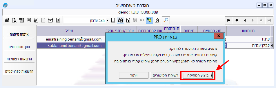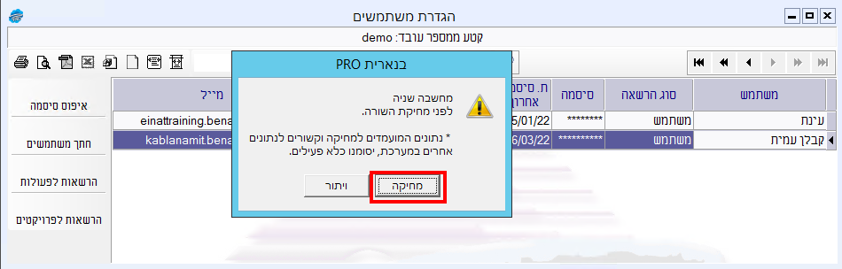 6. אם יש בתוכנה נתונים שקשורים למשתמש שמוחקים תופיע הודעה על כך שמחיקת המשתמש לא תפגע בקישורים, אלא רק תמנע שימוש עתידי בשם המשתמש שמוחקים.