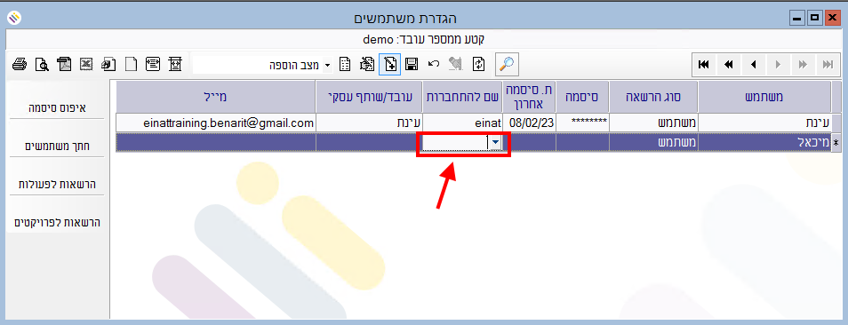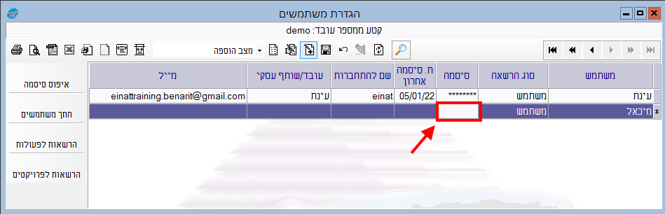 12. את השדה “סיסמה” להשאיר ריק. בכניסה הראשונה לתוכנה המשתמש החדש יצטרך להגדיר לעצמו סיסמה: