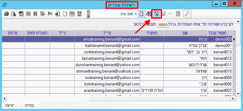 10. נפתח המסך “רשימת עובדים”. במסך “רשימת עובדים” ללחוץ בסרגל הכלים על כפתור ההוספה: