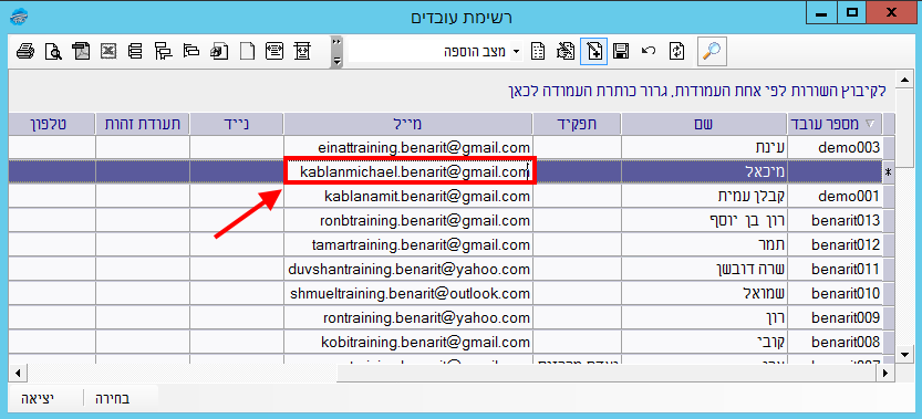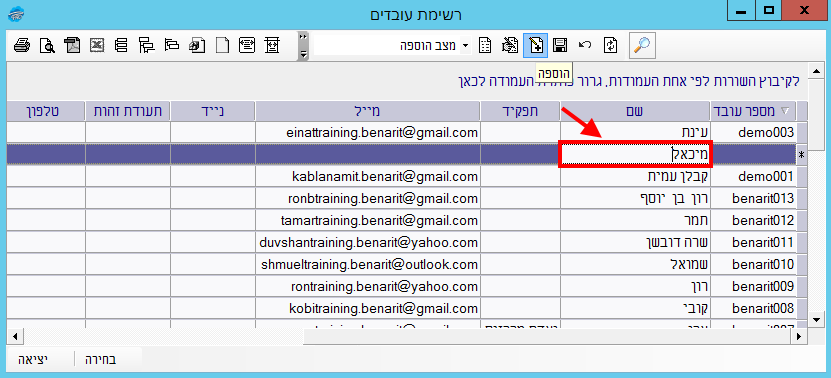 11. מתווספת שורה ריקה במסך “רשימת עובדים”. בשורה שהתווספה להזין בשדה “שם” את שם העובד החדש: