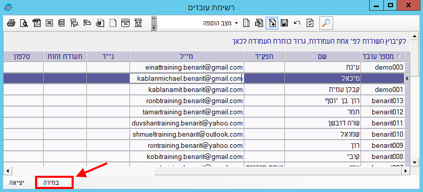 13. ללחוץ על הכפתור “בחירה” בתחתית המסך “רשימת עובדים”: