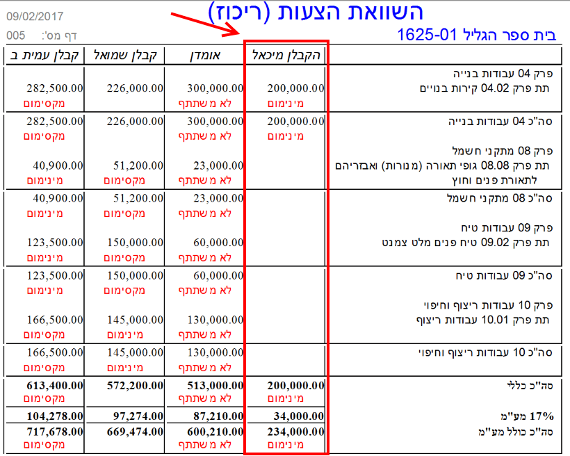 6. נפתח המסך “השוואת הצעות” ומציג את רשימת ההצעות שהוגשו על ידי הקבלנים: