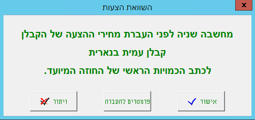 18. תופיע הודעת וידוא לפני העברת המחירים של הקבלן הזוכה אל כתב הכמויות הראשי. פעולת העברת המחירים בונה עותק של כתב הכמויות המקורי עם המחירים של הקבלן הזוכה, לקראת הפיכתו לחוזה: