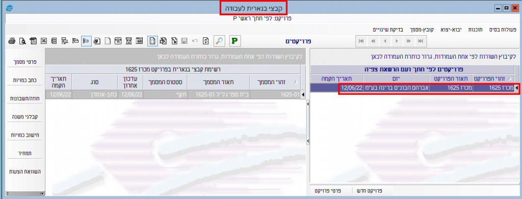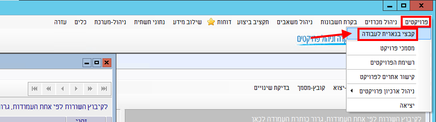 כדי לעבור לעיין במסמך כתב הכמויות עם המחירים של הקבלן הזוכה ולהמשיך לשלב של הגדרת החוזה וחשבונות הביצוע, יש להיכנס לתפריט “פרויקטים” ולבחור > “קבצי בנארית לעבודה”: