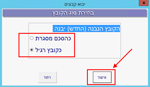 7. אם ברשותכם רישיון שימוש במודול “הסכמי מסגרת” תיפתח חלונית שבה ניתן לבחור האם הקובץ המיובא ייבנה כהסכם מסגרת או כקובץ רגיל. יש לסמן את האפשרויות הרצויה.