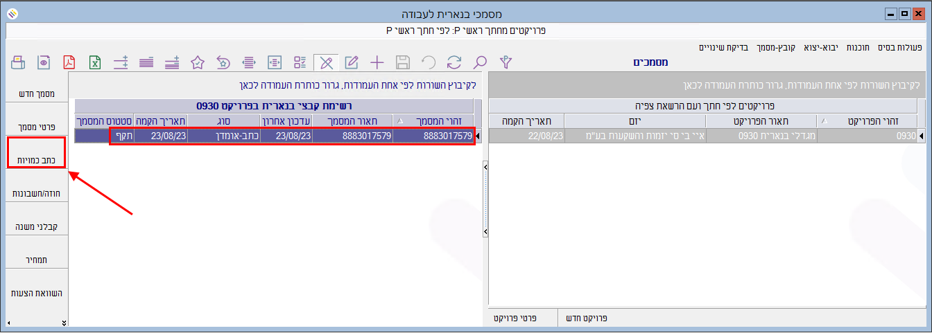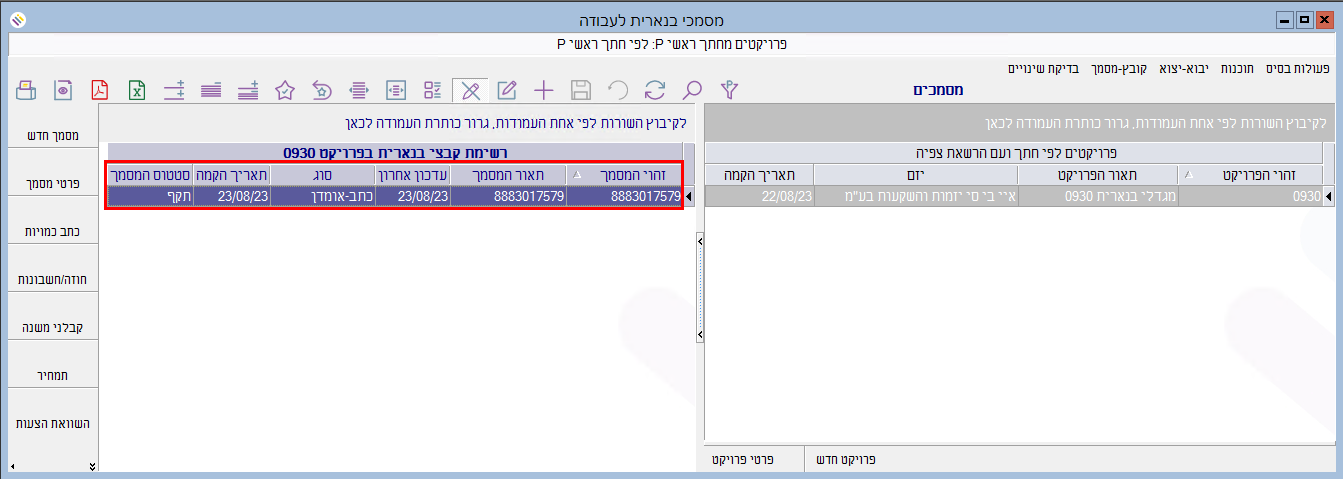 1. במסך הראשי, להיכנס לתפריט “פרויקטים” ולבחור בפקודה “מסמכי בנארית לעבודה”: