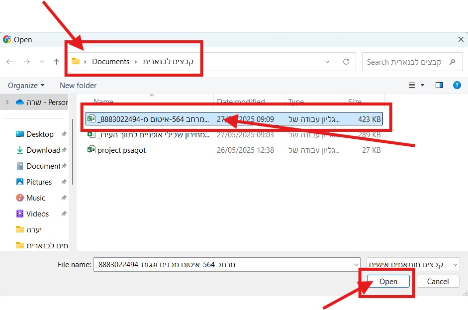 יש לסמן את הקובץ שרוצים לייבא וללחוץ על “Open”: