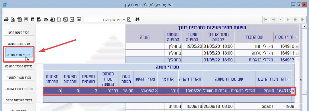 (1) במסך “הצעות פעילות למכרזים בענן” יש לוודא שמסומנת השורה של מכרז המשנה, ואז ללחוץ בסרגל הכפתורים השמאלי על הכפתור “סעיפי מכרז משנה”: