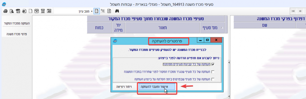 בחלונית זו יש מספר אפשרויות שמתייחסות למצבים שבהם יופיעו התרעות במהלך העתקת הסעיפים לפני ביצוע ההעתקה. כברירת מחדל מסומנת רק האפשרות הראשונה של הצגת התרעה רק כאשר מבוצעת העתקה של קבוצת סעיפים. אם רוצים שתופיע התרעה גם כאשר מעתיקים סעיפים בגרירה וגם כאשר מעתיקים סעיף בודד יש לסמן את האפשרויות האלה. כדי להתקדם לשלב של העתקת הסעיפים יש ללחוץ בחלונית על “אישור ומעבר להעתקה”: