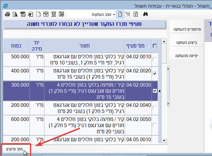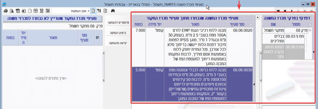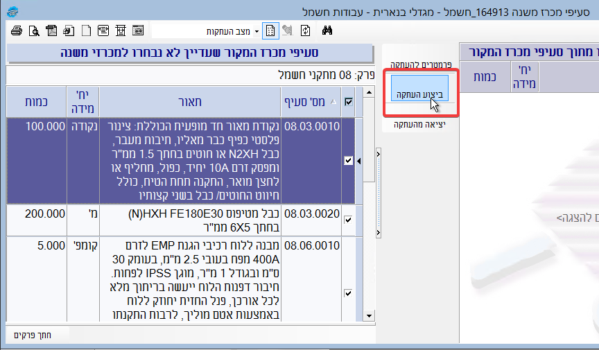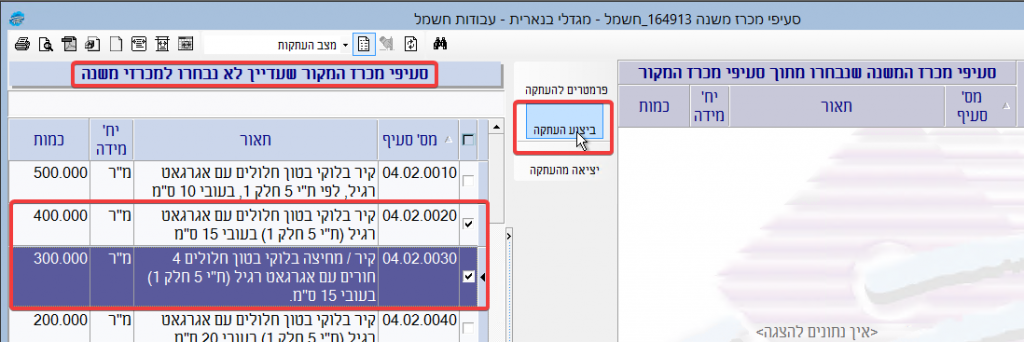 לאחר לחיצה על “ביצוע העתקה” יועתקו כל הסעיפים המסומנים מהחלונית השמאלית אל האזור הימני של המסך שמציג את סעיפי מכרז המשנה: