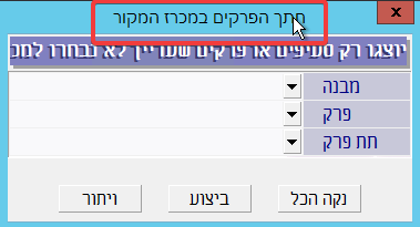 נפתחת החלונית “חתך פרקים במכרז המקור”. חלונית זו מאפשרת לבחור את המבנה, הפרק או תת-הפרק שרוצים להעתיק אותו מהמכרז הראשי אל מכרז המשנה: