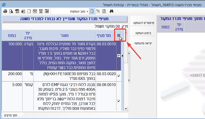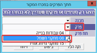 ברשימה הנפתחת בשדה הרלוונטי יש לסמן את המבנה/פרק/תת-פרק שרוצים להעתיק. אדגים כאן העתקה של פרק עבודות החשמל: