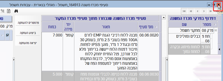 (4) בתום העתקת הסעיפים יש ללחוץ על כפתור ה-X בפינה הימנית העליונה של המסך “סעיפי מכרז משנה”: