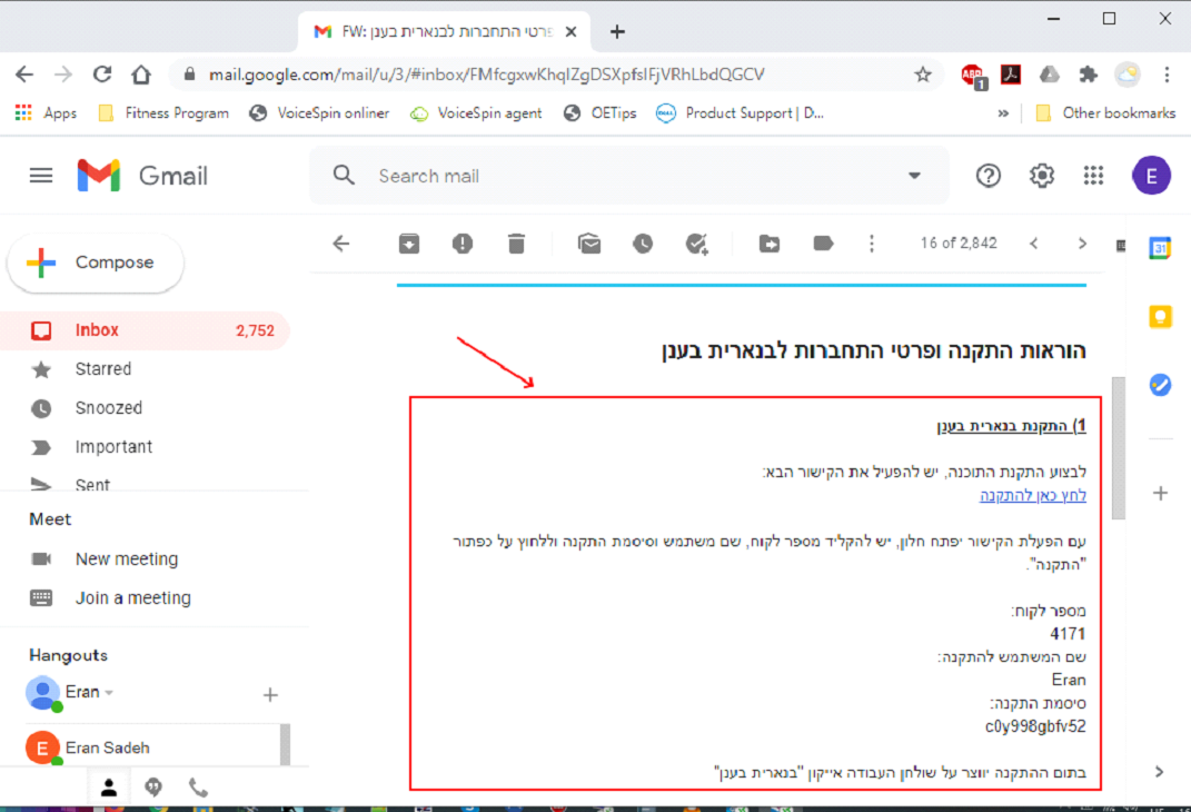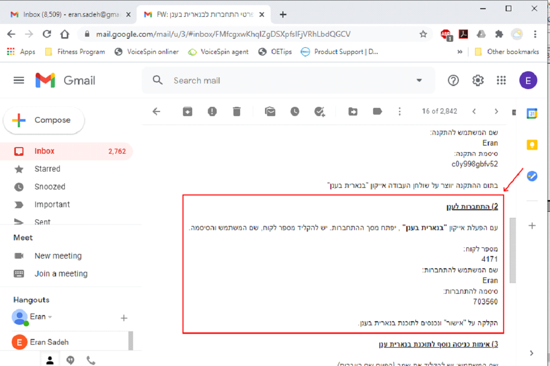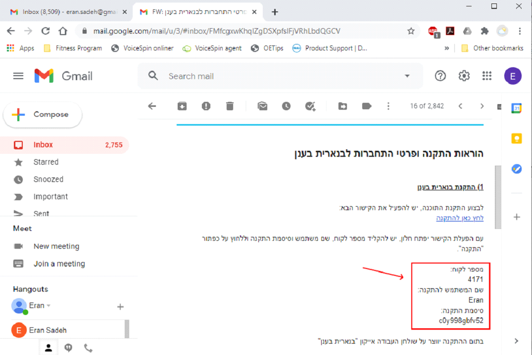שימו לב: הסיסמה שהופיעה בחלק הראשון של הודעת המייל היא סיסמה להתקנה, והסיסמה שמופיעה בחלק השני היא סיסמה להתחברות.