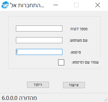 בחלונית הזו יש להזין את פרטי ההתחברות (מספר לקוח, שם משתמש וסיסמת התחברות) שמופיעים בחלק השני של הודעת המייל שנשלחה אליכם:
