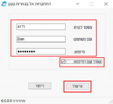 לאחר מילוי פרטי ההתחברות וסימון האפשרות “שמור שם וסיסמא” יש ללחוץ על “אישור”: