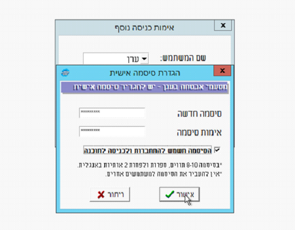 לאחר ההתחברות לבנארית בענן, יופיע מסך הכניסה לתוכנה שבו תוכלו לקבוע לעצמכם סיסמה אישית שתשמש גם לצורך ההתחברות לבנארית בענן וגם לצורך הכניסה לתוכנה בפעמים הבאות: