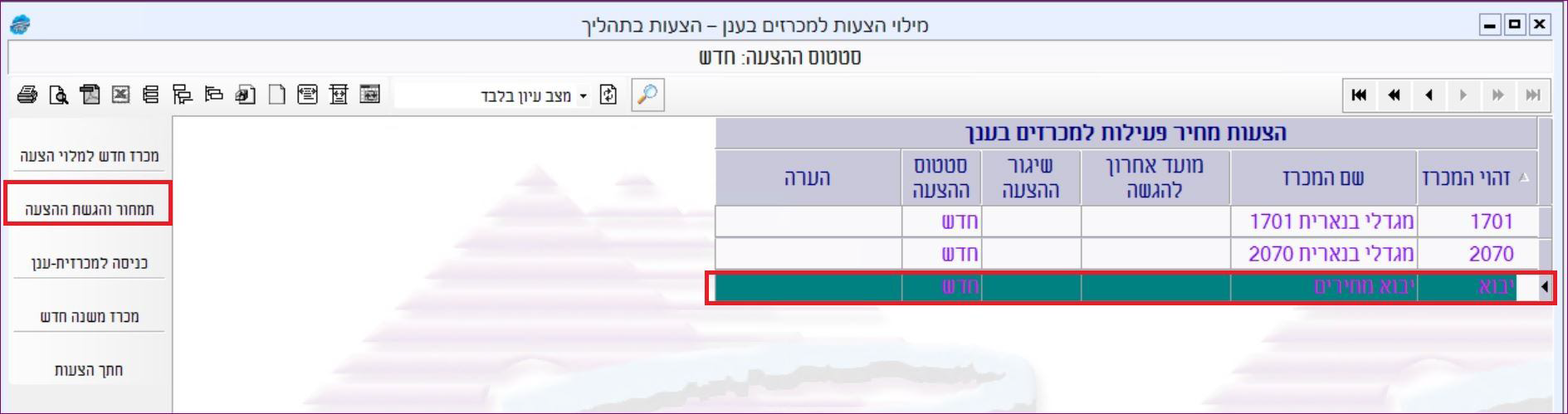 - לסמן את שורת המכרז > וללחוץ על הכפתור תמחור והגשת ההצעה:
