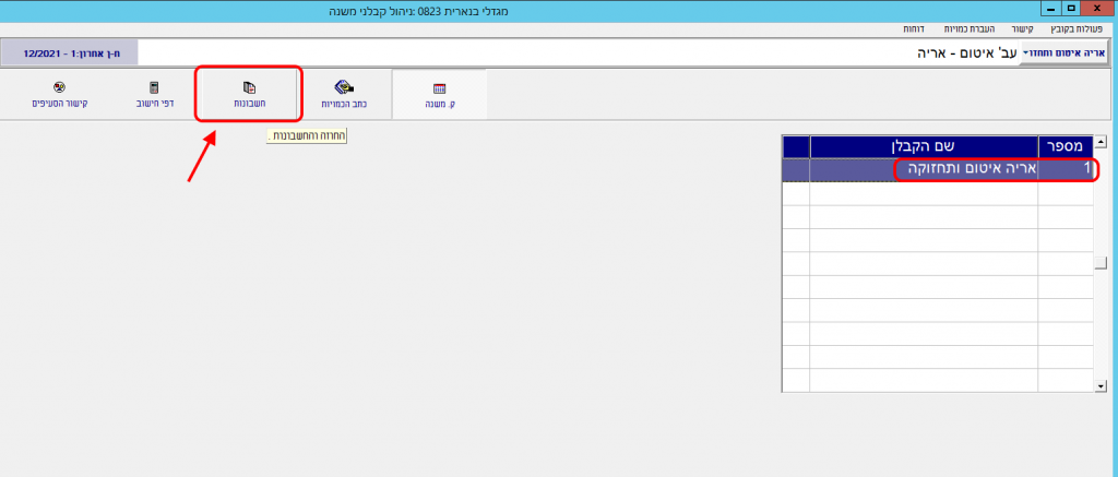 2. בתוכנת קבלני משנה, לסמן ברשימת קבלני המשנה את הקבלן שממנו רוצים לקזז את עלות הרכש באופן אוטומטי, ואז ללחוץ על הכפתור “חשבונות”: