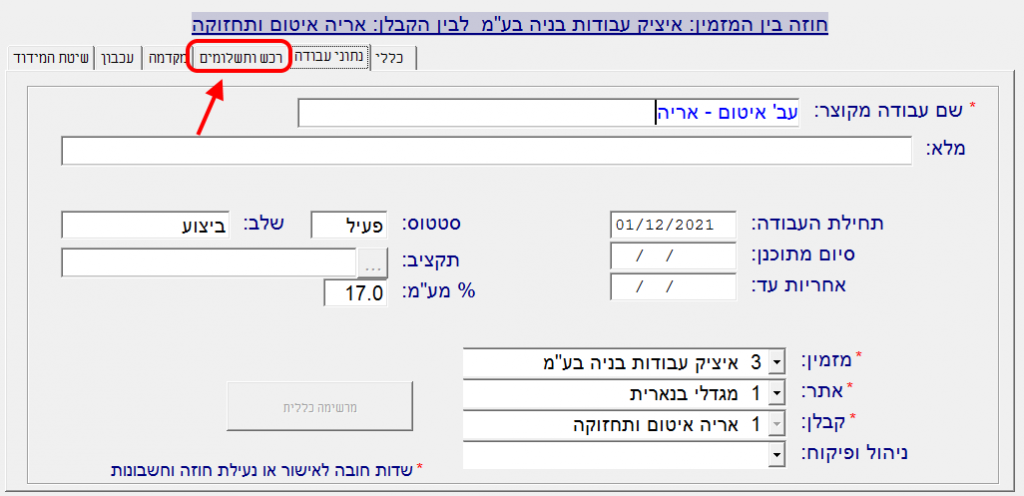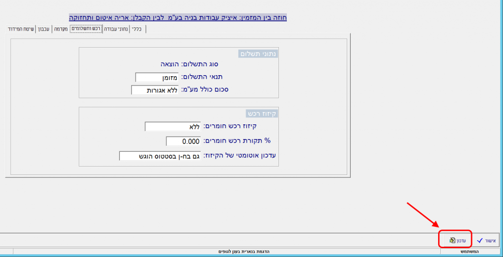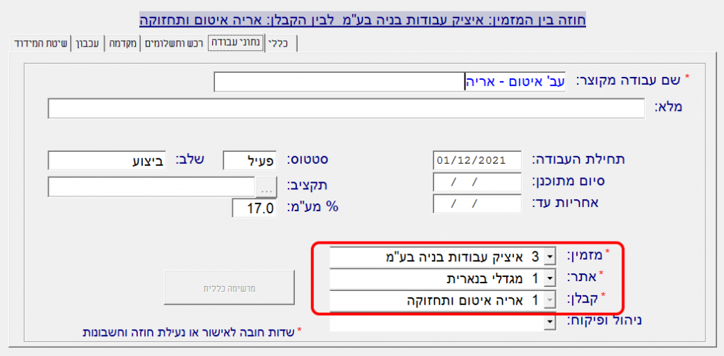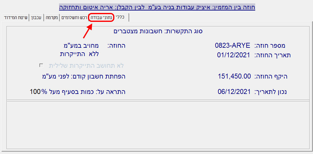 4. לאחר הגדרת הנתונים הכלליים של החוזה בלשונית “כללי” יש לעבור ללשונית “נתוני עבודה”: