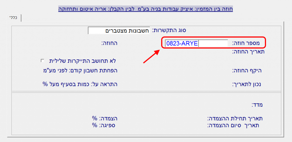 יש לשים לב לנתון שמזינים בשדה “מספר חוזה”, כיוון שמספר החוזה ישמש בתור מספר מזהה שבאמצעותו נוכל בהמשך התהליך להגדיר את קיזוז הרכש מהחוזה הספציפי הזה: