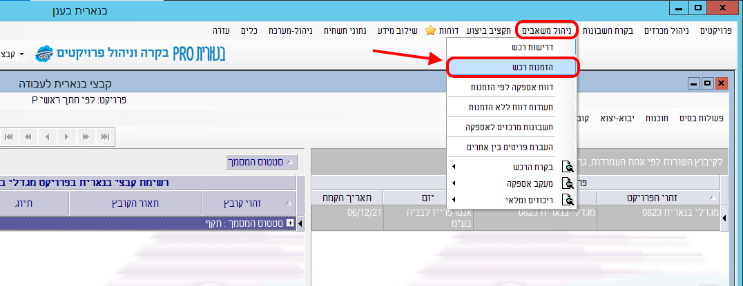 לאחר שהופעל מנגנון קיזוז הרכש האוטומטי בחוזה של קבלן המשנה, כפי שהוסבר בשלב הקודם, יש להגדיר הזמנת רכש בתוכנת “ניהול משאבים” ולקשר את הפריטים המוזמנים לחוזה של קבלן המשנה שממנו רוצים לקזז את עלות הרכש, בהתאם להנחיות הבאות: