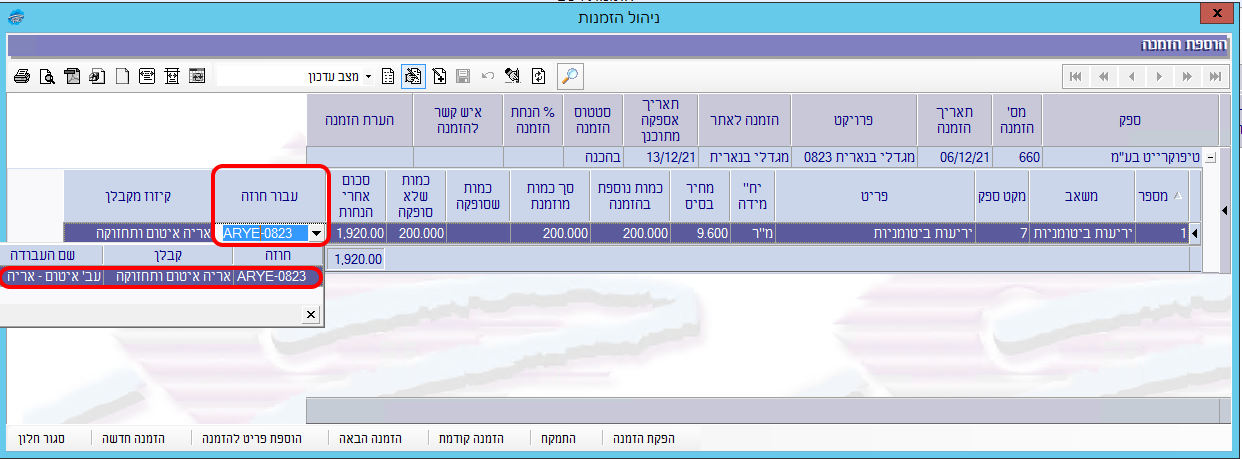 3. בשורה של הפריט המוזמן, לפתוח את הרשימה הנפתחת בשדה “עבור חוזה” ולבחור מהרשימה את חוזה קבלן המשנה שממנו רוצים לקזז את עלות הפריט המוזמן: