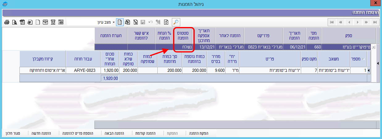 4. כדי שסכום הרכש שהוזמן עבור קבלן המשנה יבוא לידי ביטוי במסך “קיזוז רכש” בחשבונות של קבלן המשנה, יש להעביר את סטטוס הזמנת הרכש ל”מאושר” או “נשלח”: