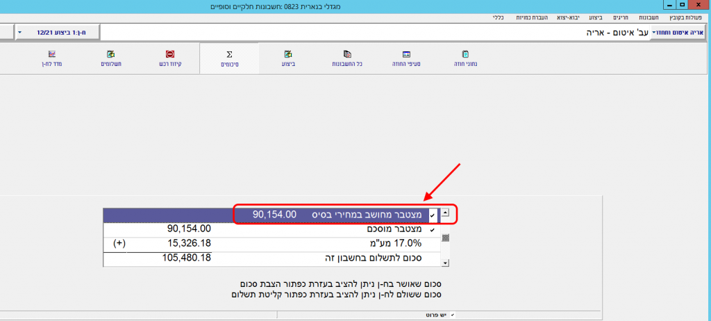 בחלונית “סיכומים” ללחוץ לחיצה כפולה על השורה “מצטבר מחושב במחירי בסיס” כדי להציג את פירוט השורה: