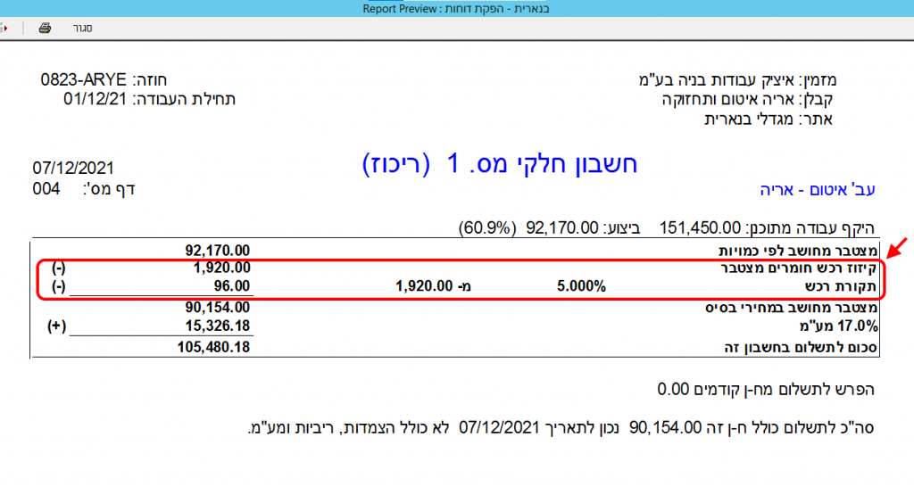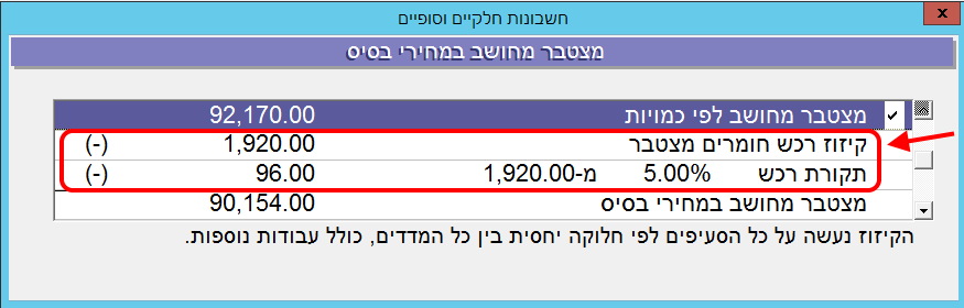 בחלונית הפירוט שנפתחת ניתן לראות את ההפחתה של קיזוז הרכש, ואם הוגדרה תקורת רכש היא גם תופחת: