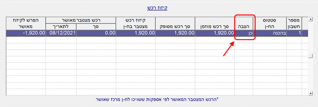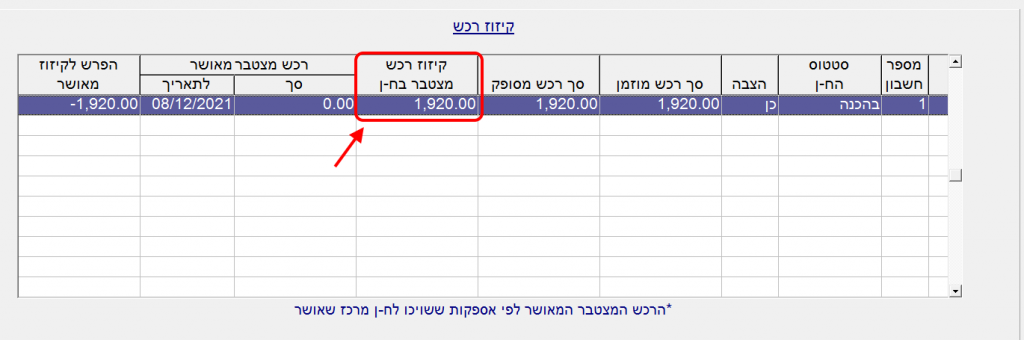 5. בעקבות הצבת סך האספקה לחשבון, יופיע סכום האספקה בעמודה “קיזוז רכש מצטבר בח-ן”: