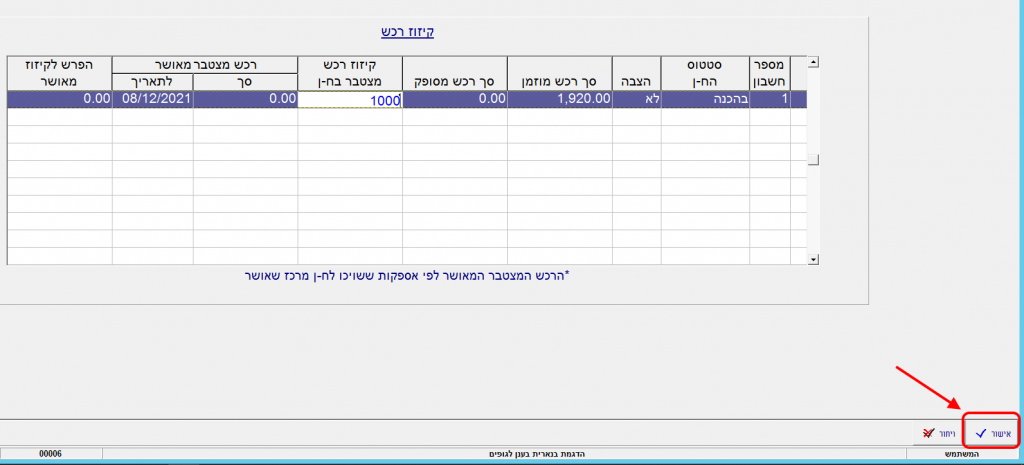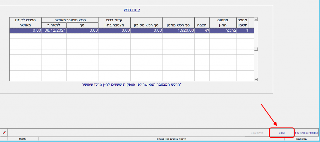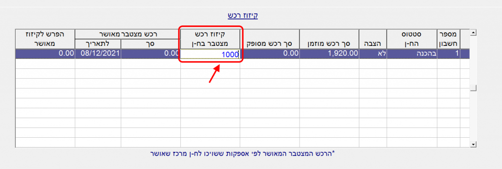 5. בעקבות לחיצה על הכפתור “הצבה” השדה “קיזוז רכש מצטבר בח-ן” נפתח להקלדה.
