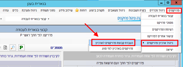 - במסך הראשי של בנארית להיכנס לתפריט “פרויקטים” > להצביע על “ניהול ארכיון פרויקטים” > ולבחור בפקודה: “העברת קבוצת פרויקטים לארכיון”: