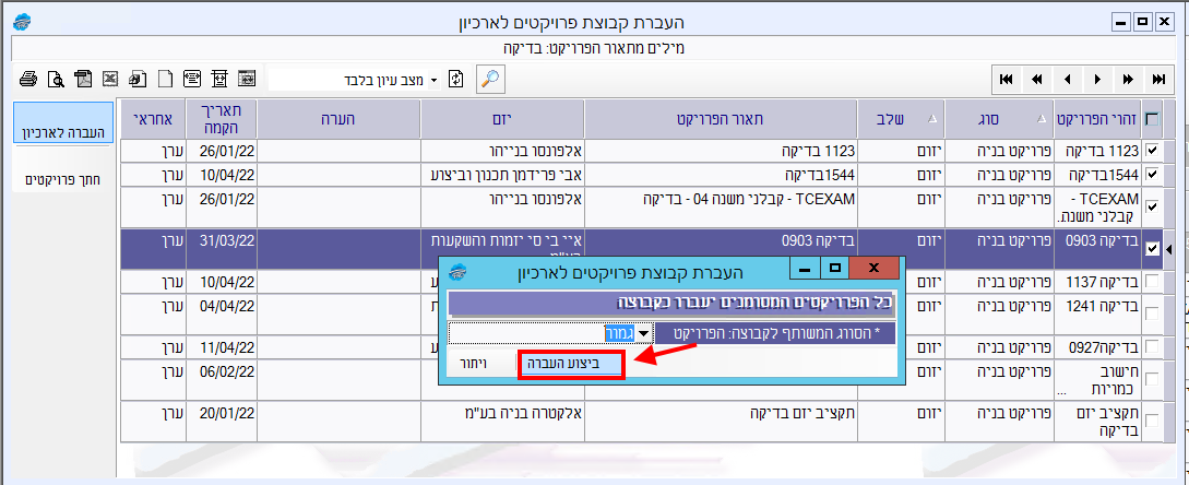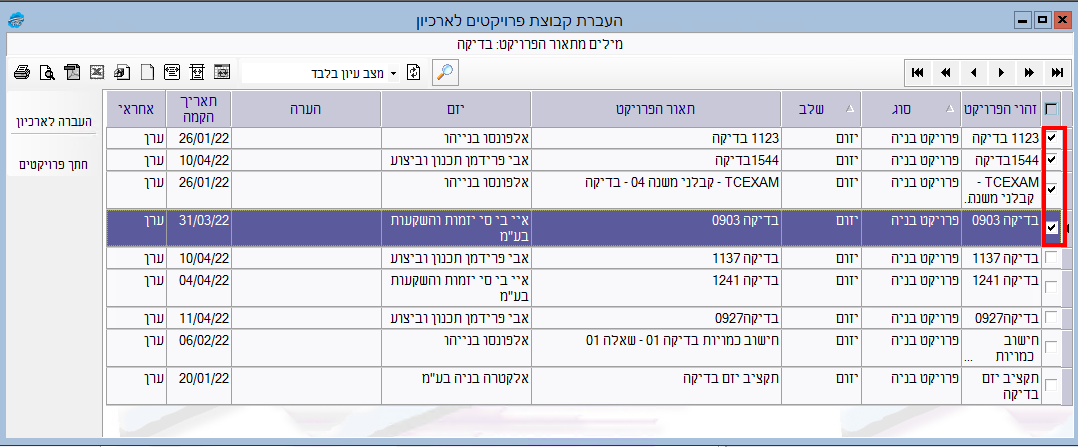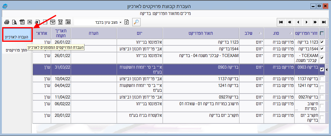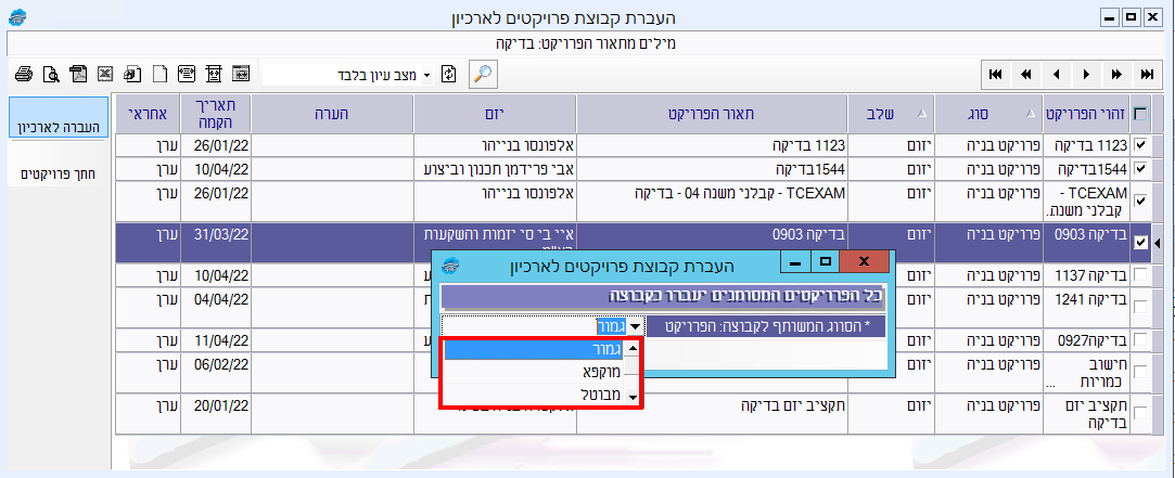 כדי להעביר בבת אחת קבוצת פרויקטים אל ארכיון הפרויקטים יש לבצע את הפעולות הבאות: