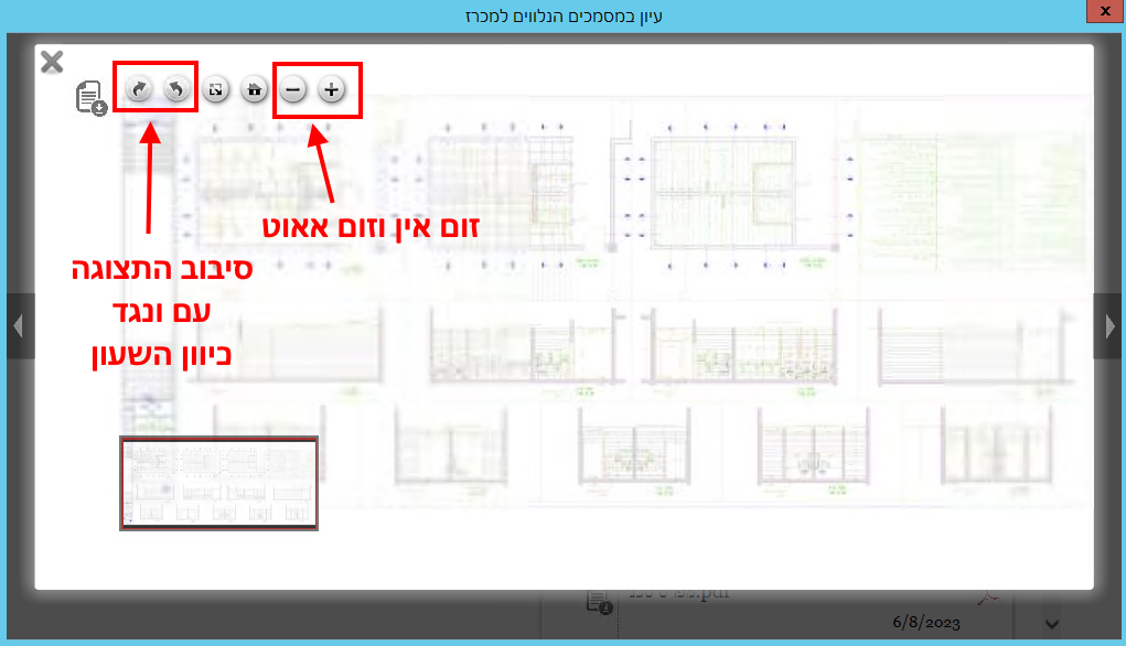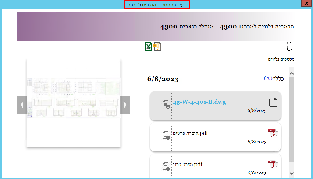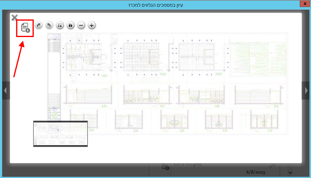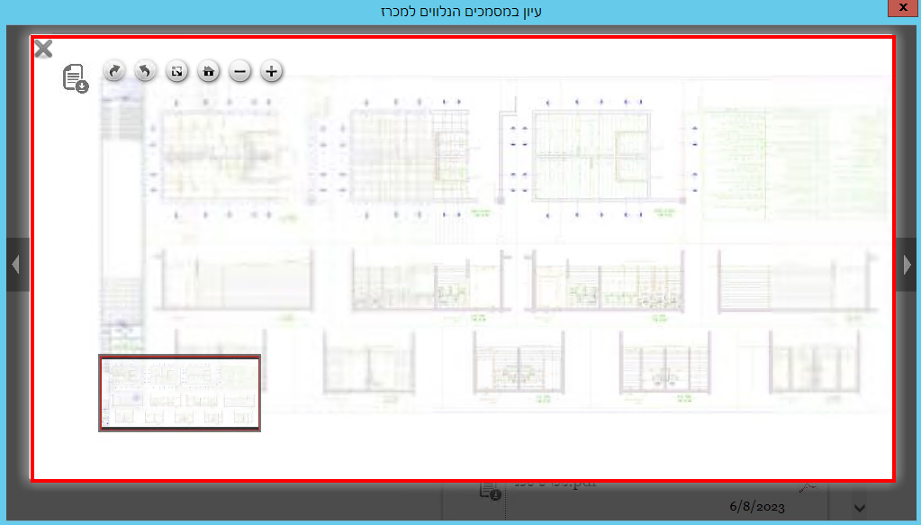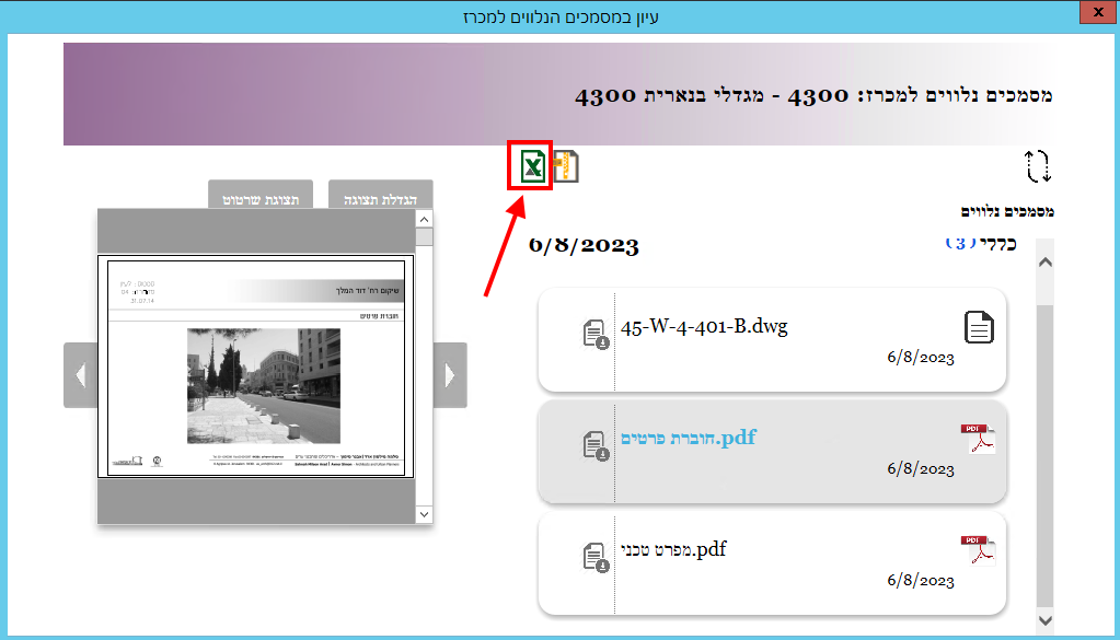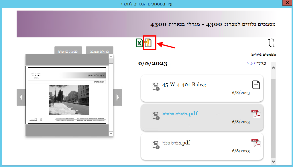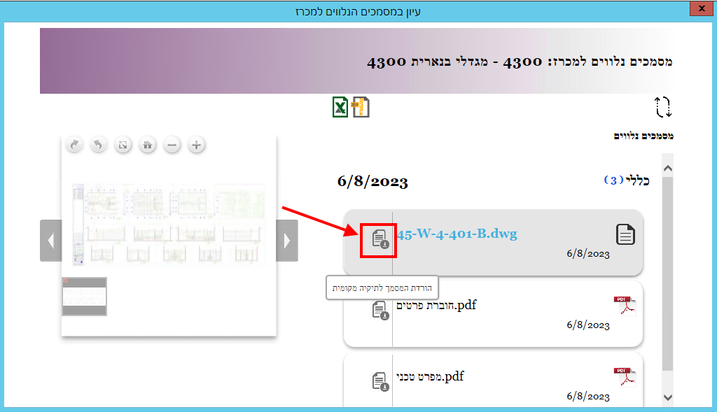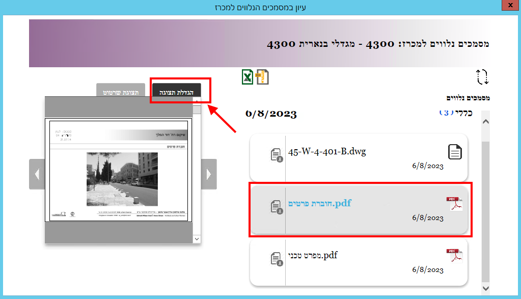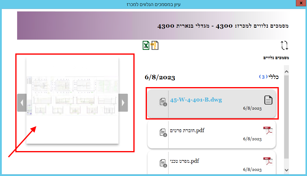כדי לעיין במסמך מסוג שרטוט, יש לסמן אותו ואז ללחוץ בצד שמאל באזור של התצוגה המקדימה: