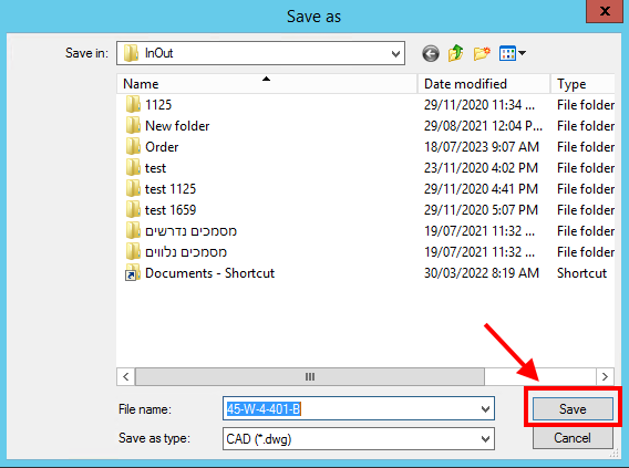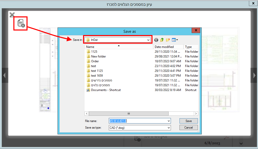 לאחר לחיצה על כפתור ההורדה, נפתחת חלונית שבה יש להגדיר את התיקיה שבה יישמר הקובץ ואת שמו. כברירת מחדל, הקובץ יישמר לתיקיה InOut שקיצור דרך אליה נמצא על שולחן העבודה: