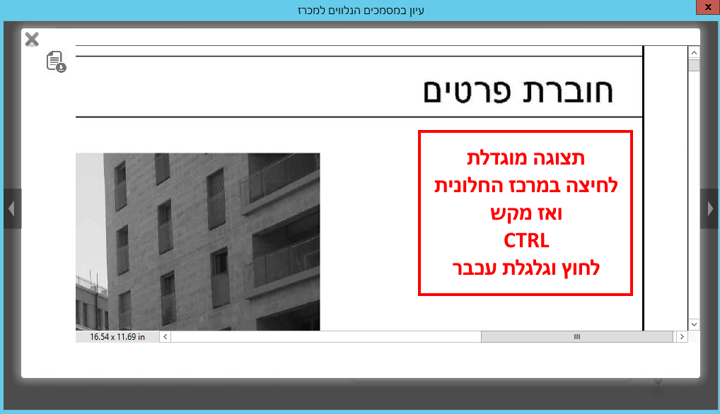לאחר לחיצה על “הגדלת תצוגה” תוכן המסמך יוצג בחלונית התצוגה המקדימה. כדי להגדיל/להקטין את התצוגה (זום אין/זום אאוט) יש ללחוץ לחיצה אחת במרכז התצוגה, ואז להחזיק את המקש CTRL במקלדת ולגלגל את גלגלת העכבר קדימה (כדי להגדיל) ואחורה (כדי להקטין):