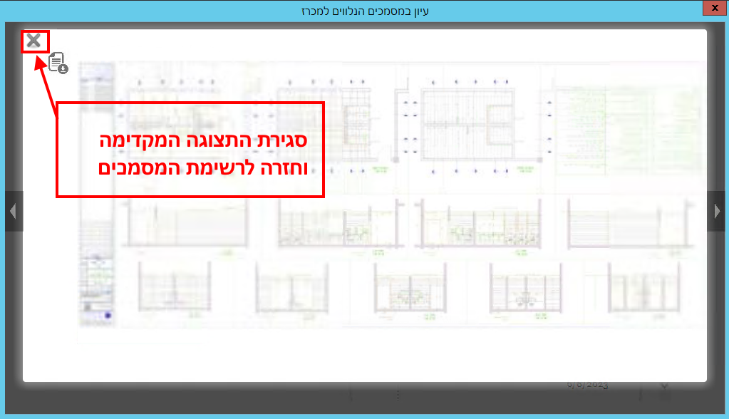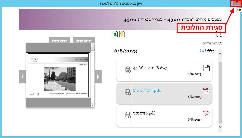 כדי לסגור את חלונית המסמכים הנלווים, יש ללחוץ על כפתור ה-X בפינה הימנית העליונה: