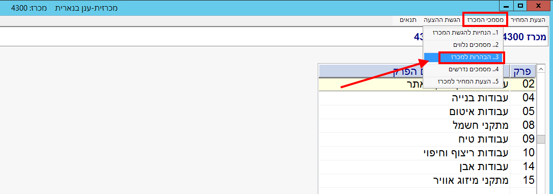 בתוכנת “מכרזית-ענן” להיכנס בצד ימין למעלה לתפריט “מסמכי המכרז” ולבחור בפקודה “הבהרות למכרז”: