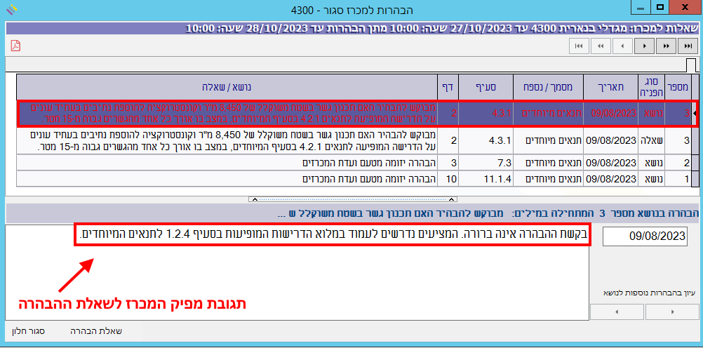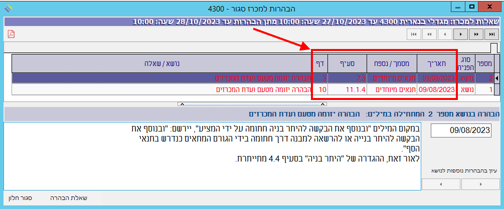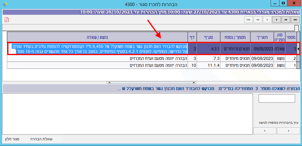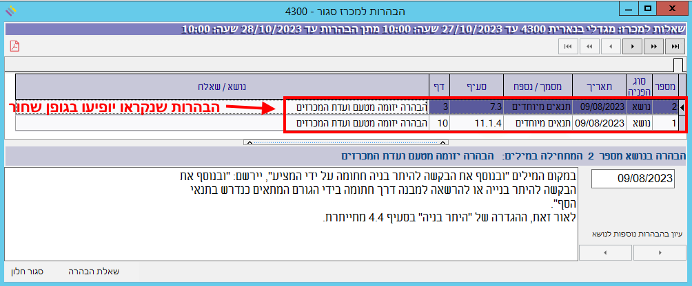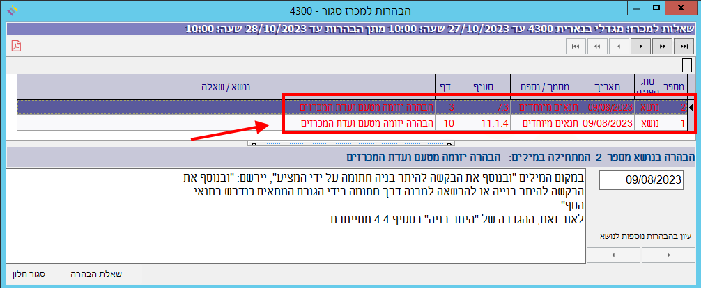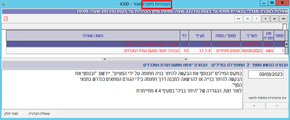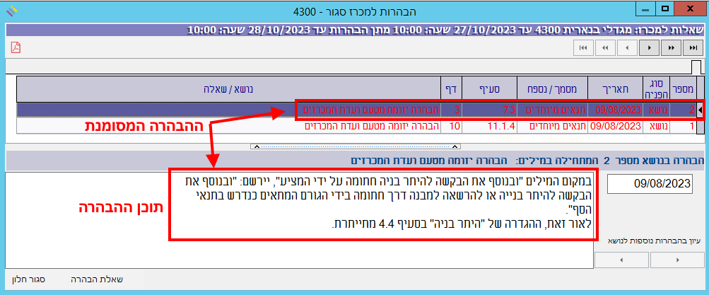 בחלונית העליונה מופיעה רשימת ההבהרות, ובחלונית התחתונה מופיע תוכן ההבהרה של ההבהרה המסומנת: