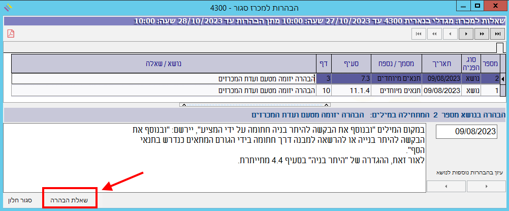 בחלונית “הבהרות למכרז” ללחוץ על הכפתור “שאלת הבהרה”: