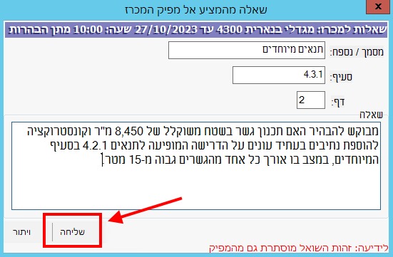 כדי להשלים את שליחת השאלה אל מפיק המכרז יש ללחוץ על הכפתור “שליחה”: