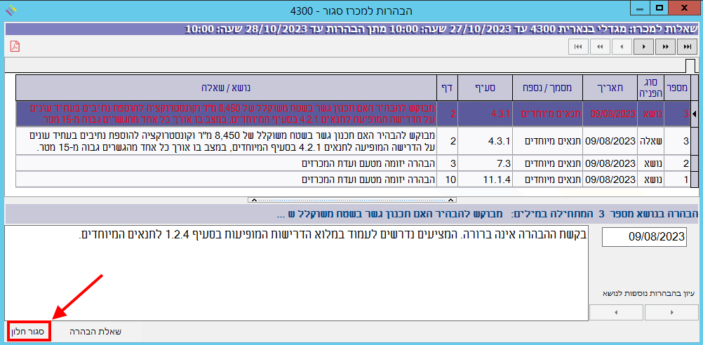 כדי לצאת מחלונית “הבהרות למכרז” יש ללחוץ על הכפתור “סגור חלון”: