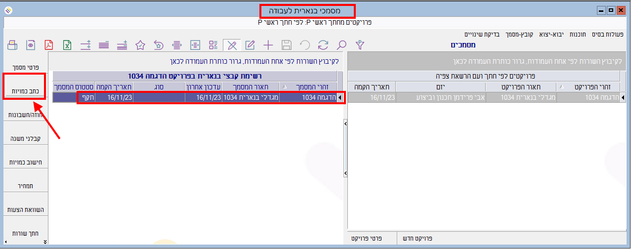 במסך “מסמכי בנארית לעבודה” לסמן את קובץ כתב הכמויות שאליו רוצים להעתיק סעיפים מהמחירון האינטרנטי, ובסרגל הכפתורים השמאלי ללחוץ על “כתב כמויות”: