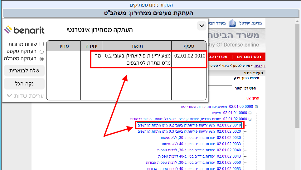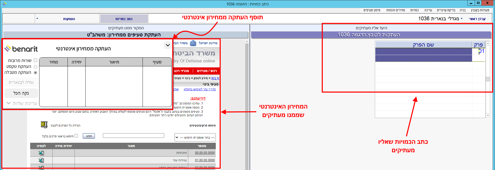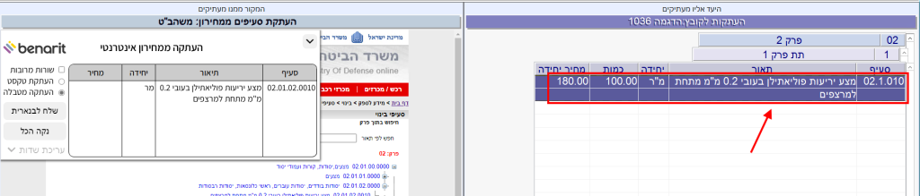 בחלונית השמאלית מופיע המחירון האינטרנטי שממנו רוצים להעתיק, ומעליו בצד שמאל מופיע תוסף ההעתקה ממחירון אינטרנטי, שאליו נעתיק זמנית את הסעיפים לפני שנעבירם אל כתב הכמויות בתוכנת בנארית.